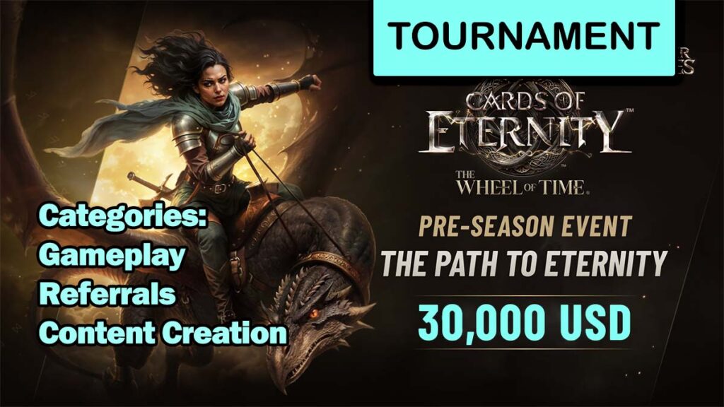 đ Event Summary: “The Path to Eternity” is a $30,000 prize pool event celebrating the Cards of Eternity community. Compete in gameplay challenges, create content, or refer friends to earn rewards in categories like ranked wins, legendary cards, and YouTube content.