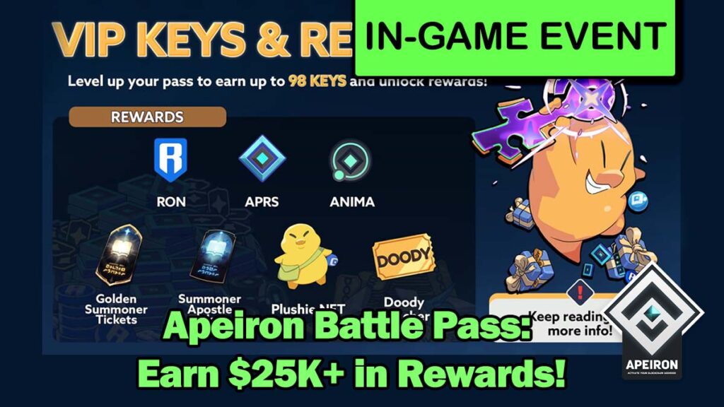 ๐ Event Summary: Apeironโs latest Battle Pass event is here! Unlock VIP Keys to claim $25,000+ in tokens & NFTs. Earn Gold, Diamond, and Divine Keys through missions to access exclusive rewards, including $APRS, $RON, Summoner NFTs, and the mysterious Doody Vouchers!