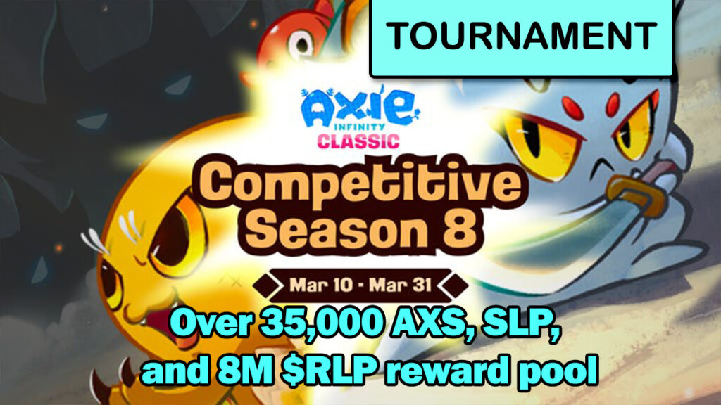 đ Event Summary: Axie Classic Competitive Season 8 is live! Compete in the arena from March 10 to March 31 for a chance to earn AXS, SLP, and Rough Love Potion. The season introduces 66 new cards, gear mechanics, a Reputation UI, and over 35,000 AXS in rewards. The top players will qualify for the Season Championship and a shot at the Axie Classic World Cup.