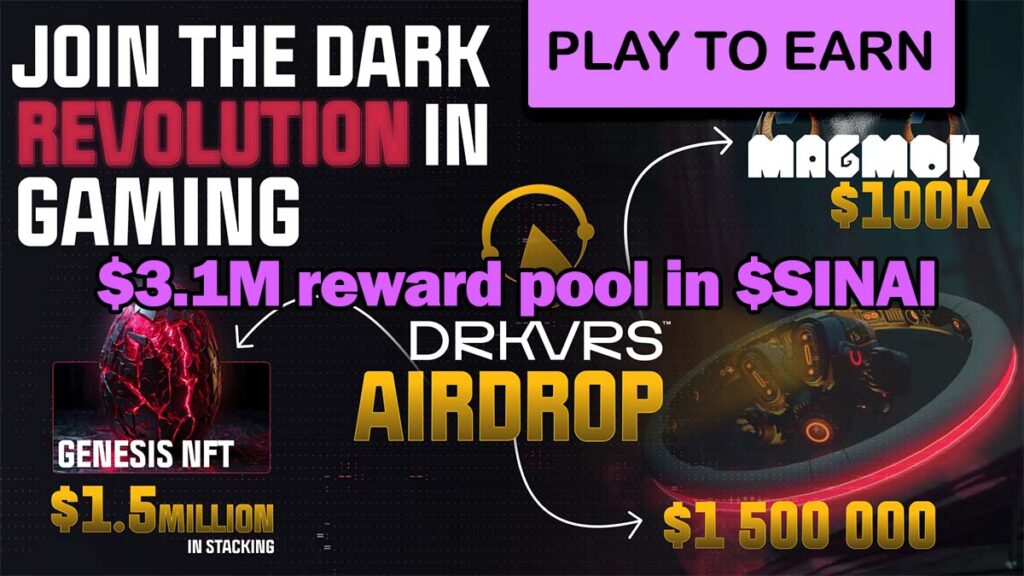 đ Event Summary: Join the DRKVRS Airdrop and earn rewards by completing social tasks, blockchain challenges, and in-game missions. Participate in staking and minting Genesis Lair NFTs to unlock $SINAI tokens and exclusive in-game benefits. A total prize pool of $3.1 million awaits!