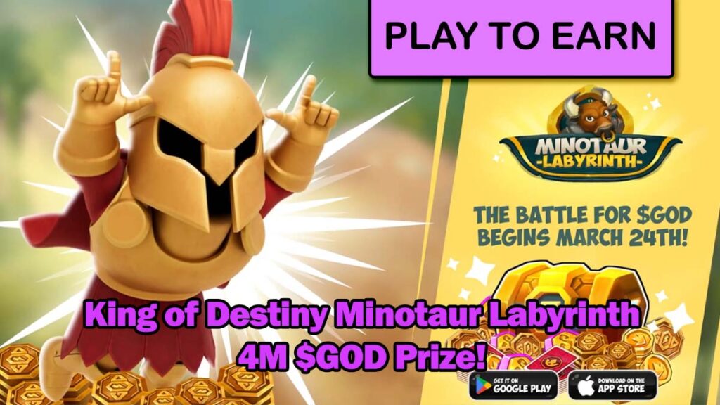 đ Event Summary: King of Destiny is hosting two major events next week with a total prize pool of 4 million $GOD, Ultimate Passes, and Paragon Elder Gods. The first event, Minotaur Labyrinth, challenges players to deal cards, catch Minotaurs, and climb the leaderboard to win rewards.