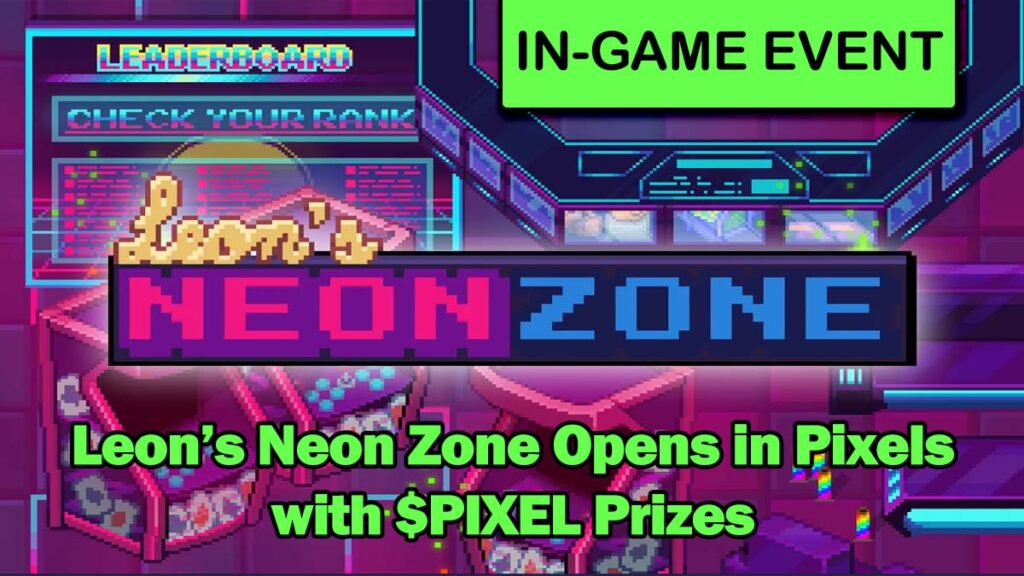 📄 Event Summary: Dive into Leon’s Neon Zone in Pixels, where players can enjoy arcade-style mini-games, compete on leaderboards, and win $PIXEL, NFT pets, wineries, and exclusive decor items using Zonez Tokens, Stuff Stubs, and Divining Doubloons!