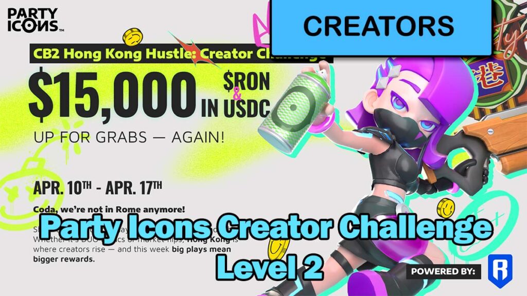 đ Event Summary: The Party Icons Hong Kong Hustle Creator Challenge Level 2 invites Ronin Creators to team up as duos, create content showcasing gameplay and market savvy in the Hong Kong map, and compete for a $15,000 prize pool in $RON and USDC, plus in-game assets.