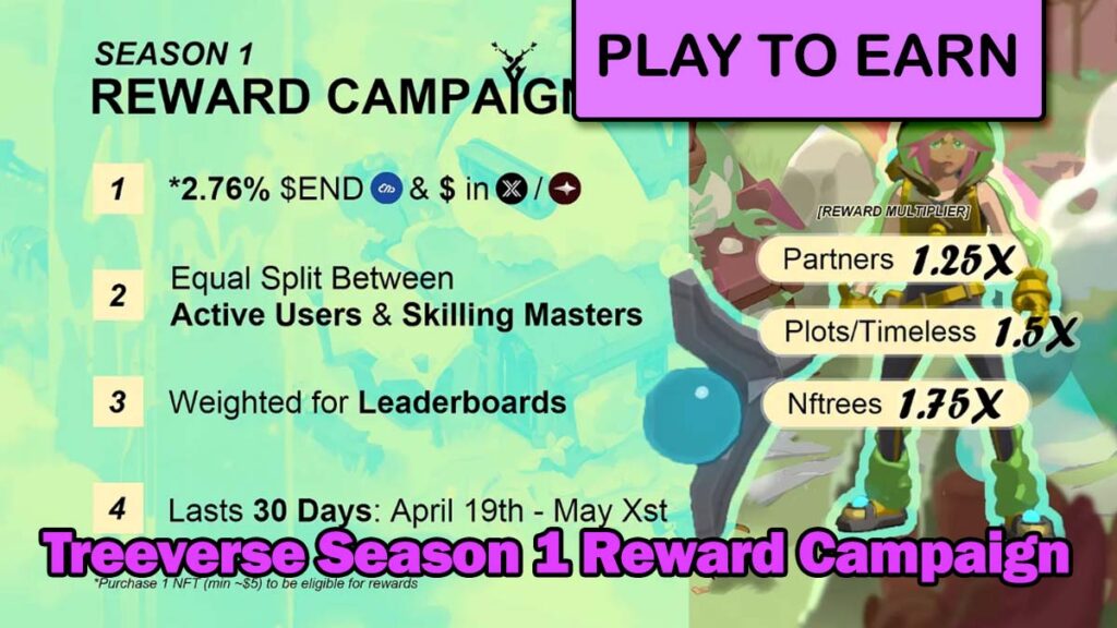 đ Event Summary: The Treeverse Season 1 Reward Campaign is a 30-day event where players complete quests, skill up, and compete on leaderboards to earn 2.76% of the $END token supply, plus $IMX and $MON rewards, with multipliers for NFT holders.